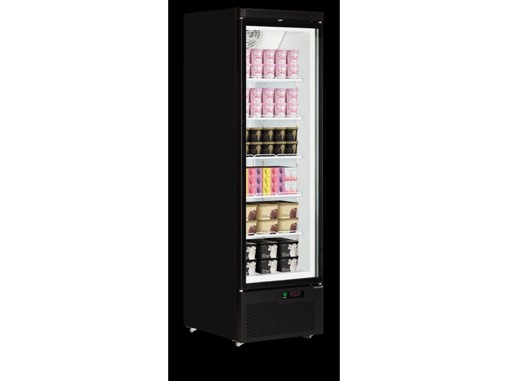 dobrá prezentácia mrazených potravín|nízka spotreba energie|vyhrievané samozatváracie presklené dvere|izolačné tvrdené trojité sklo|nastaviteľné police|ventilované chladenie|vnútorné vertikálne LED osvetlenie|spodná výstavná plocha z nehrdzavejúcej ocele |digitálny termostat a zobrazenie teploty|kolieska