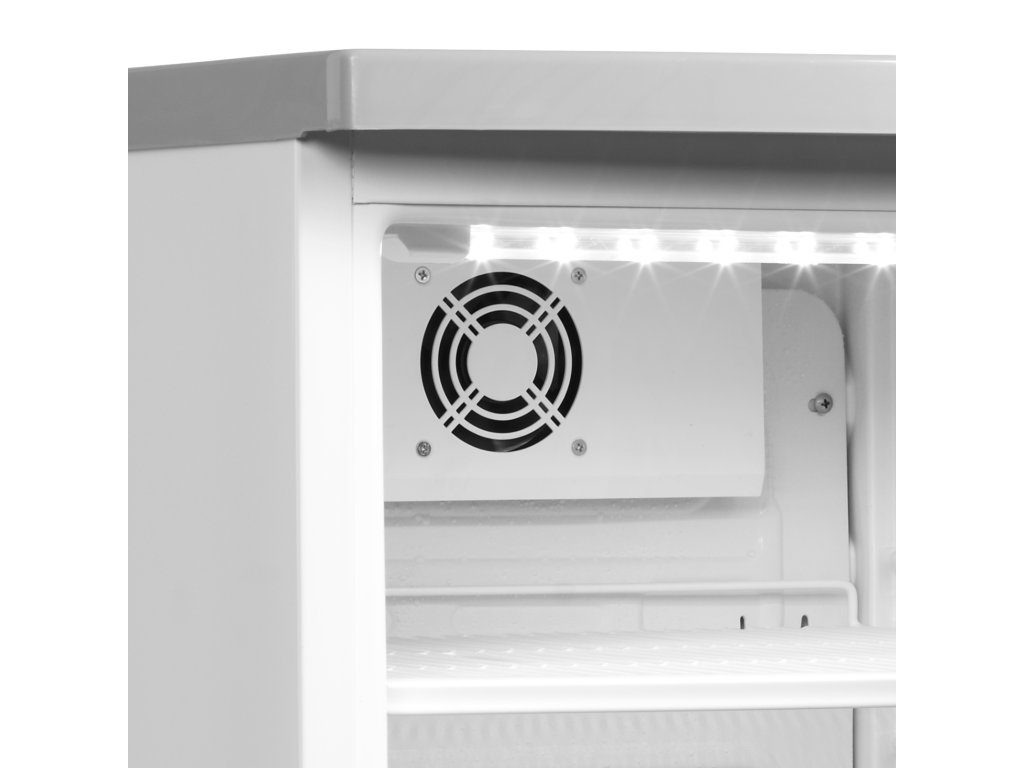 Rad malých chladiacich skríň s presklenými dverami BC WF sa dodáva v dvoch veľkostiach a ponúka skvelú viditeľnosť výrobkov. Má oblé presklené dvere s integrovanou rukoväťou a ide meniť otváranie dverí. Chladiaca skriňa je vybavená nastaviteľnými drôtenými policami, vďaka ktorým môžete interiér jednoducho prispôsobiť svojim špecifickým potrebám. Chladenie s pomocným ventilátorom zabezpečuje rovnomernú teplotu v skrini.