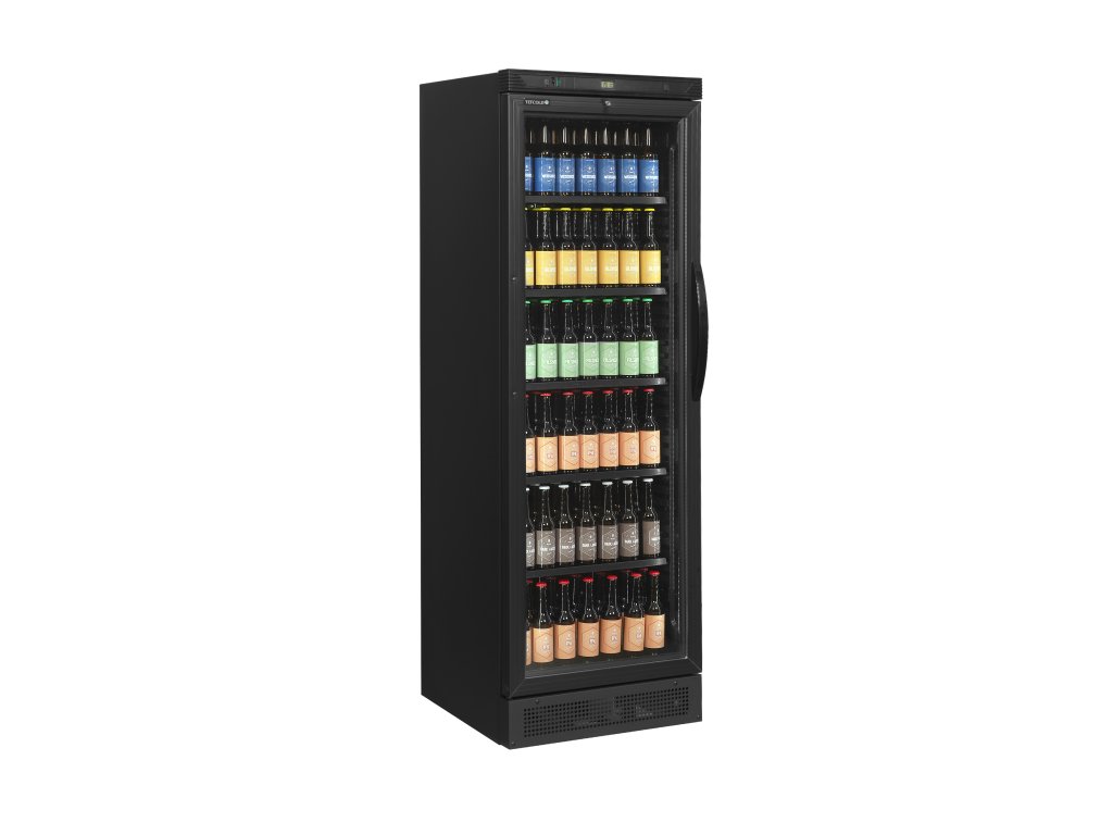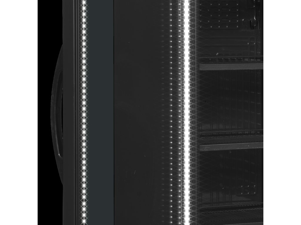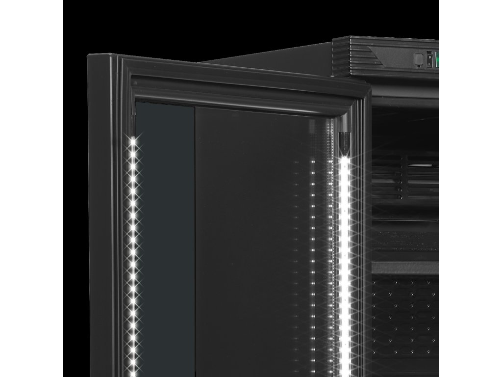 ľavé krídlové presklené dvere|čierne vnútro a vonkajšok|elegantný dizajn|vynikajúca prezentácia výrobkov|priestor na dodatočnú policu|LED osvetlenie v ráme dverí|nastaviteľné police|chladenie s pomocným ventilátorom