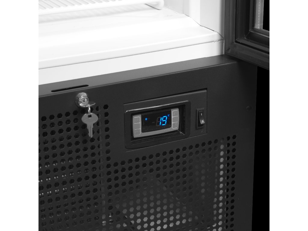 samozatváracie dvere|presklené krídlové dvere s hliníkovým rámom|priestor na dodatočnú policu|vnútorné vertikálne LED osvetlenie|nastaviteľné police|nastaviteľné nožičky|ventilované chladenie