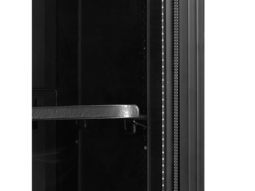 čierne vnútro a vonkajšok|presklené krídlové dvere|LED osvetlenie v ráme dverí|nastaviteľné police|chladenie s pomocným ventilátorom|vnútorná základňa z nehrdzavejúcej ocele|digitálny ukazovateľ teploty|plne automatická prevádzka