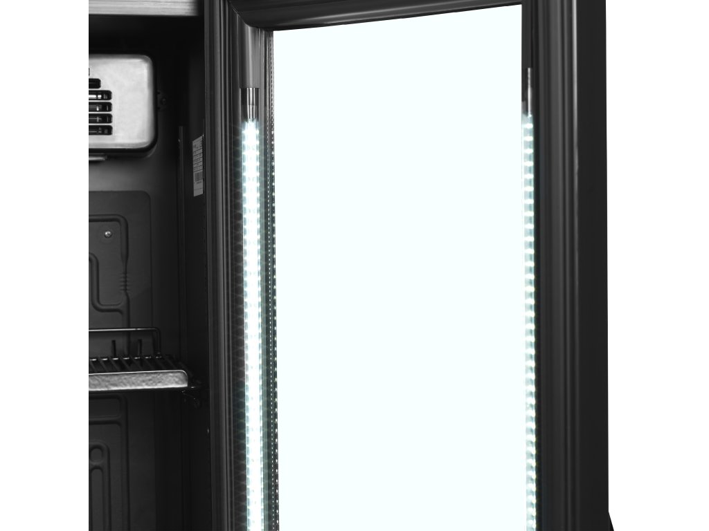 čierne vnútro a vonkajšok|reklamný panel podsvietený LED|samozatváracie presklené dvere na pántoch|LED osvetlenie v ráme dverí|nastaviteľné police|chladenie s pomocným ventilátorom|vnútorná základňa z nehrdzavejúcej ocele|digitálny ukazovateľ teploty|plne automatická prevádzka
