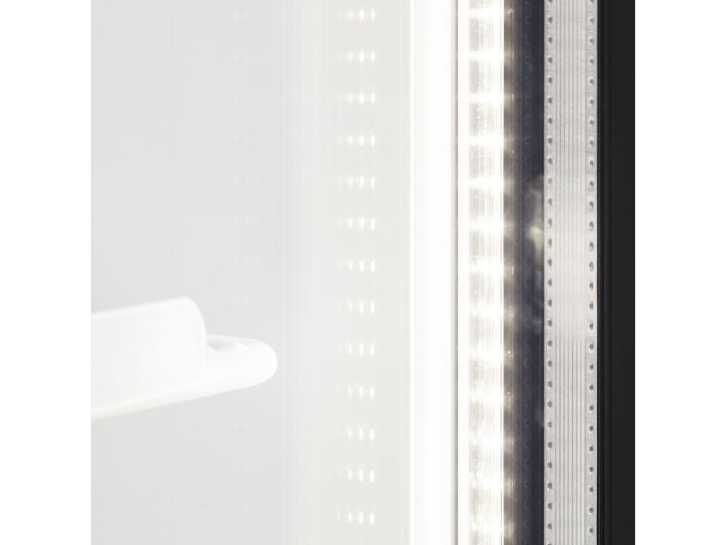 približne o 58 % energeticky účinnejší ako predchádzajúci rad FSC|samozatváracie výklopné prosklené dvere s hliníkovým rámom|reklamný panel podsvietený LED|vnútorné vertikálne LED osvetlenie|nastaviteľné police|nastaviteľné nôžky s pojazdovými valčekmi vzadu|ventilované chladenie