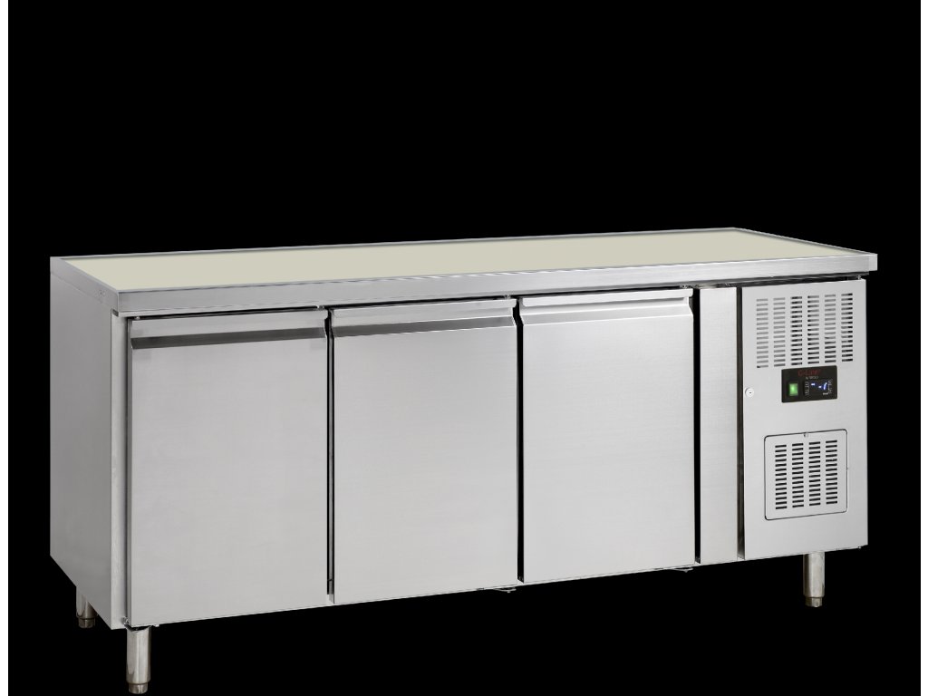 Tieto chladiace nerezové stoly sa dodávajú štandardne bez dosky, ktorá sa dá dokúpiť na objednávku s lemom, bez lemu, s drezom vľavo alebo vpravo. Agregát je tiež možné zvoliť na pravej alebo ľavej strane. Stôl má štandardne samozatváracie dvere, ale je možné ich nahradiť 1/2 zásuvkami (kód 12546). V každých dverách je nastaviteľná roštová polica GN 1/1.