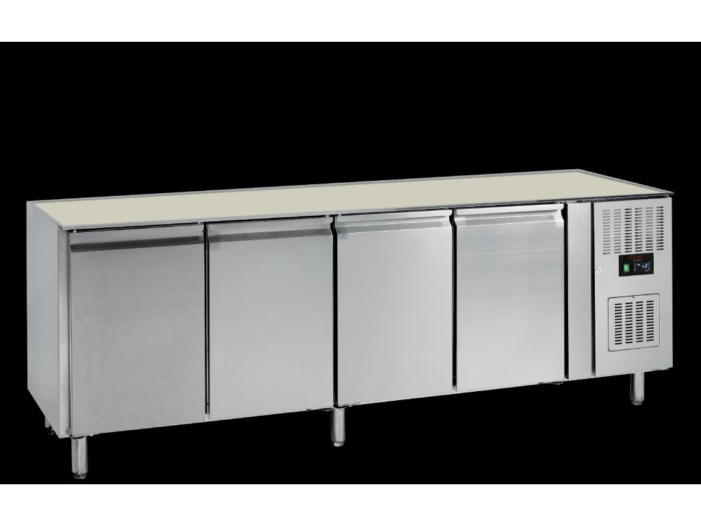 Tieto chladiace nerezové stoly sa dodávajú štandardne bez dosky, ktorá sa dá dokúpiť na objednávku s lemom, bez lemu, s drezom vľavo alebo vpravo. Agregát je tiež možné zvoliť na pravej alebo ľavej strane. Stôl má štandardne samozatváracie dvere, ale je možné ich nahradiť 1/2 zásuvkami (kód 12546). V každých dverách je nastaviteľná roštová polica GN 1/1.