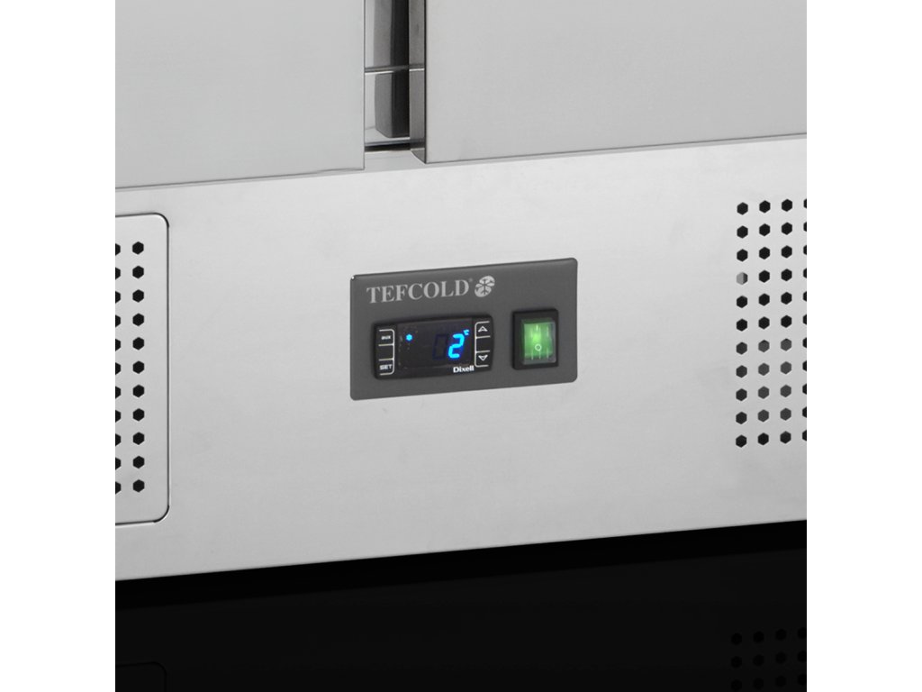 chladenie s pomocným ventilátorom|automatické odmrazovanie|digitálny termostat|kompletné nerezové prevedenie|jednoduché čistenie kondenzátora|nastaviteľné nožičky|vnútorný priestor prispôsobený GN 1/1