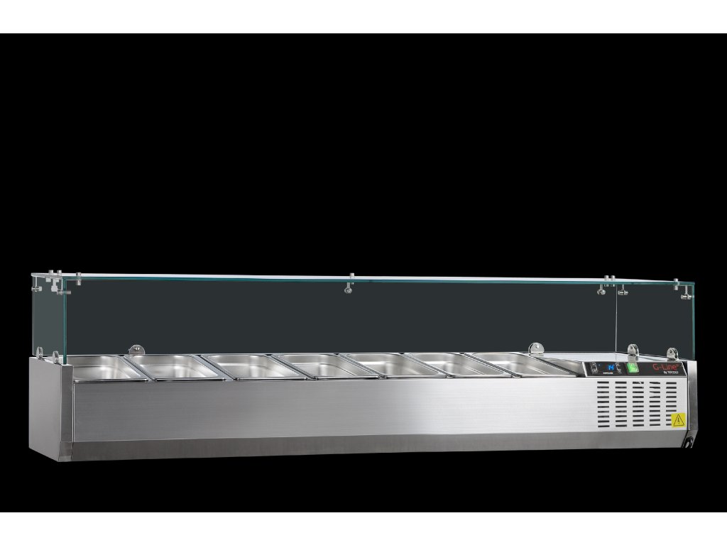 The GVC38 range of vitrine coolers is a great addition to gastro counters, as it enables you to have everything you need for food preparation within reach. It accepts GN1/3, GN1/6 and GN1/2 pans (not included). The cooler is made in SS201 stainless steel with a glass sneezeguard to protect the food. Ideal for pizza places, fast food restaurants, and sandwich shops.