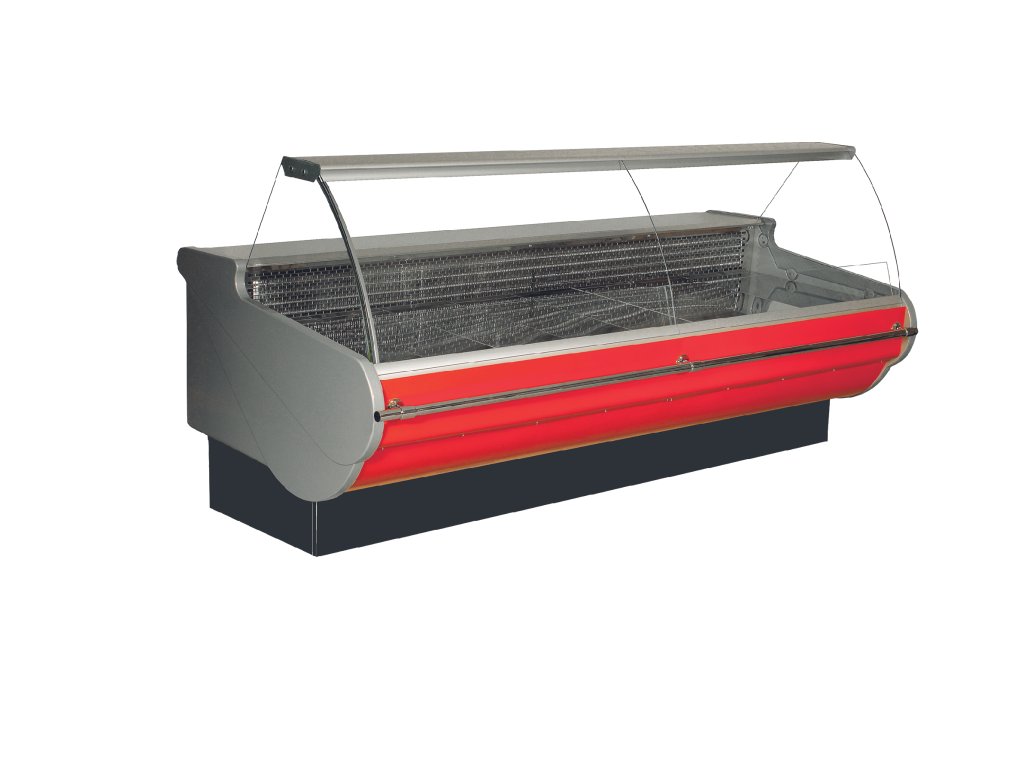 ventilované chladenie|vstavaný agregát|digitálny termostat|automatické odmrazovanie|odmrazovacia tyč pod výparníkom|vyhrievané čelné sklo|vnútorná sklenená clona proti zahmlievaniu|LED osvetlenie vitríny farba ružová (na mäso)|nerezová výstavná plocha|nerezový úložný priestor|nerezová odkladacia doska|bočnice ABS|zadné plexi krytie|chrómovaná tyč proti nárazu|zásuvka 230 V / 50 Hz