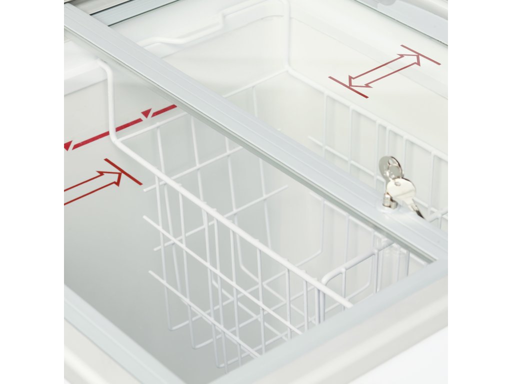 rovné posuvné presklené veká so zámkom|ideálne pre reklamný polep|digitálny teplomer|kolieska s brzdou|drôtené koše, biele|klimatická trieda 5 - vysoký výkon aj v teplom prostredí