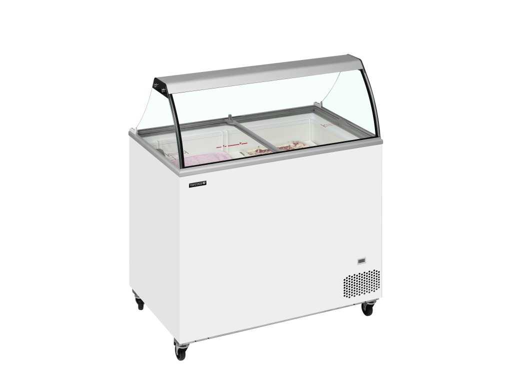 predné oblé sklo|rovné posuvné presklené veká so zámkom|úložný priestor pod košmi|ideálne pre reklamný polep|digitálny teplomer|kolieska s brzdou|klimatická trieda 5 - vysoký výkon aj v teplom prostredí|Na objednávku: koše vhodné pre GN na zmrzlinu|tento model pojme sedem 5l plastových vaničiek