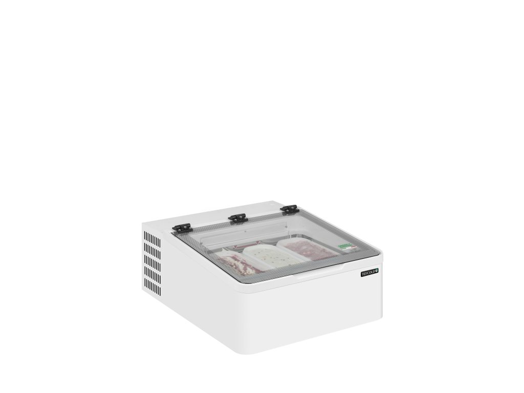 model na pult|naklonená výstavná plocha pre lepšiu prezentáciu|vhodné pre 5l vaničky na zmrzlinu (nie sú súčasťou)|Ideálny pre bufety|ľahký prístup k výrobkom|rovné sklenené veko na pántoch|statické chladenie|nastaviteľné nožičky|na objednávku zásobník na nanuky