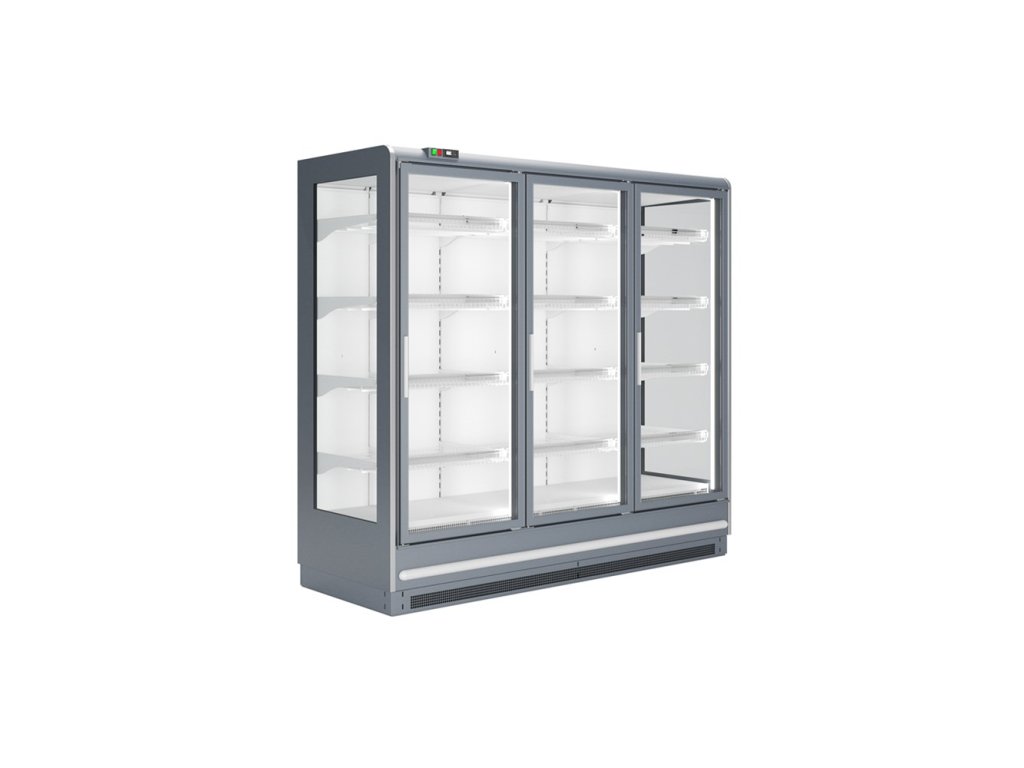 ventilované chladenie, bez vstavaného agregátu, verzia chladiaca, presklené krídlové dvere, digitálny termostat, nástrekový ventil - možnosť chladiv R452A, R448A, R449A, automatické odmrazovanie, presklené bočnice, 3 rady roštových polic, cenovkové lišty, odmrazovacia tyč na výparníku, možnosť spájania do zostáv - bočnice 3 cm, vertikálne LED osvetlenie