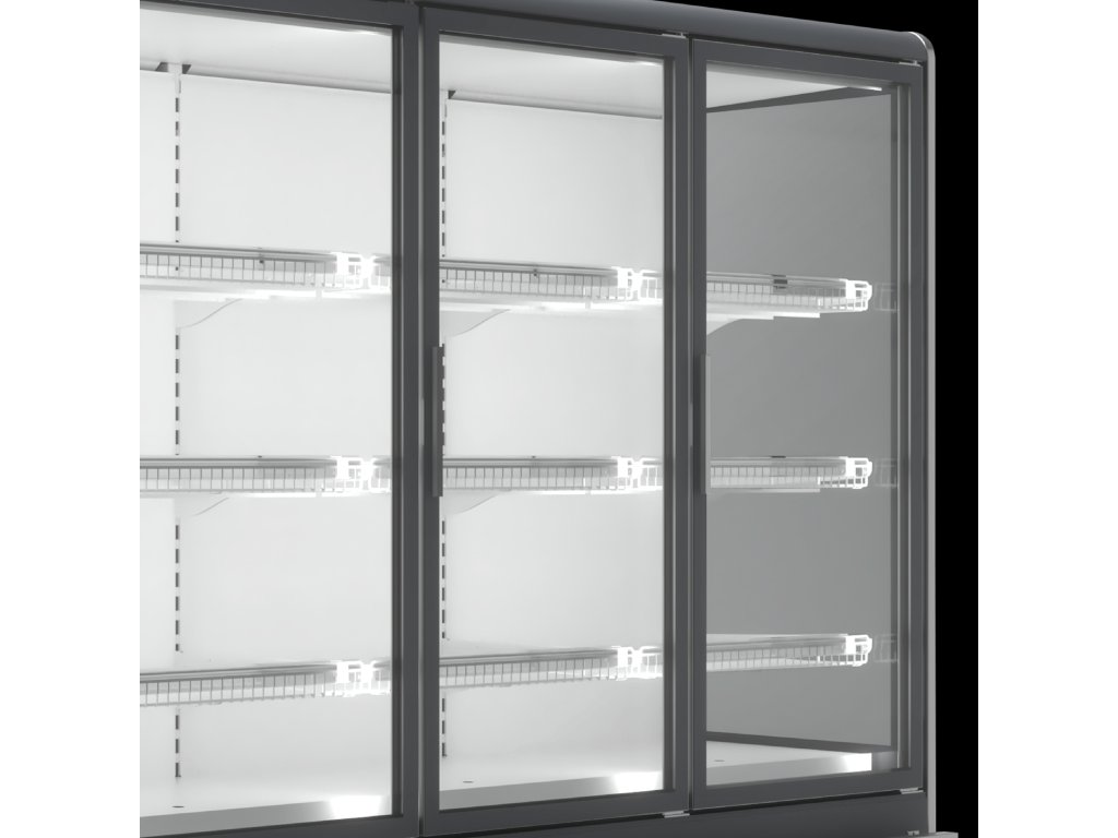 ventilované chladenie|bez vstavaného agregátu|verzia mraziaca|presklené krídlové dvere|digitálny termostat|nástrekový ventil - možnosť chladiv R452A, R448A, R449A|automatické odmrazovanie|presklené bočnice|3 rady roštových polic|cenovkové lišty|odmrazovacia tyč na výparníku|možnosť spájania do zostáv - bočnice 3 cm|vertikálne LED osvetlenie