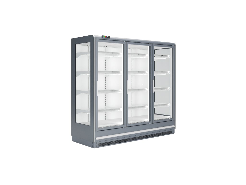 ventilované chladenie|bez vstavaného agregátu|verzia mraziaca|presklené krídlové dvere|digitálny termostat|nástrekový ventil - možnosť chladiv R452A, R448A, R449A|automatické odmrazovanie|presklené bočnice|3 rady roštových polic|cenovkové lišty|odmrazovacia tyč na výparníku|možnosť spájania do zostáv - bočnice 3 cm|vertikálne LED osvetlenie