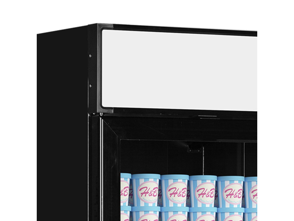 reklamný panel podsvietený LED|vyhrievané sklo zabraňujúce kondenzácii|samozatváracie dvere so zarážkou na otvorenie a ľahké plnenie|nastaviteľné police|digitálny termostat a zobrazenie teploty|vnútorné LED osvetlenie s vypínačom|vnútorná základňa z nehrdzavejúcej ocele|ventilované chladenie|automatické odmrazovanie|kolieska a nastaviteľné nožičky