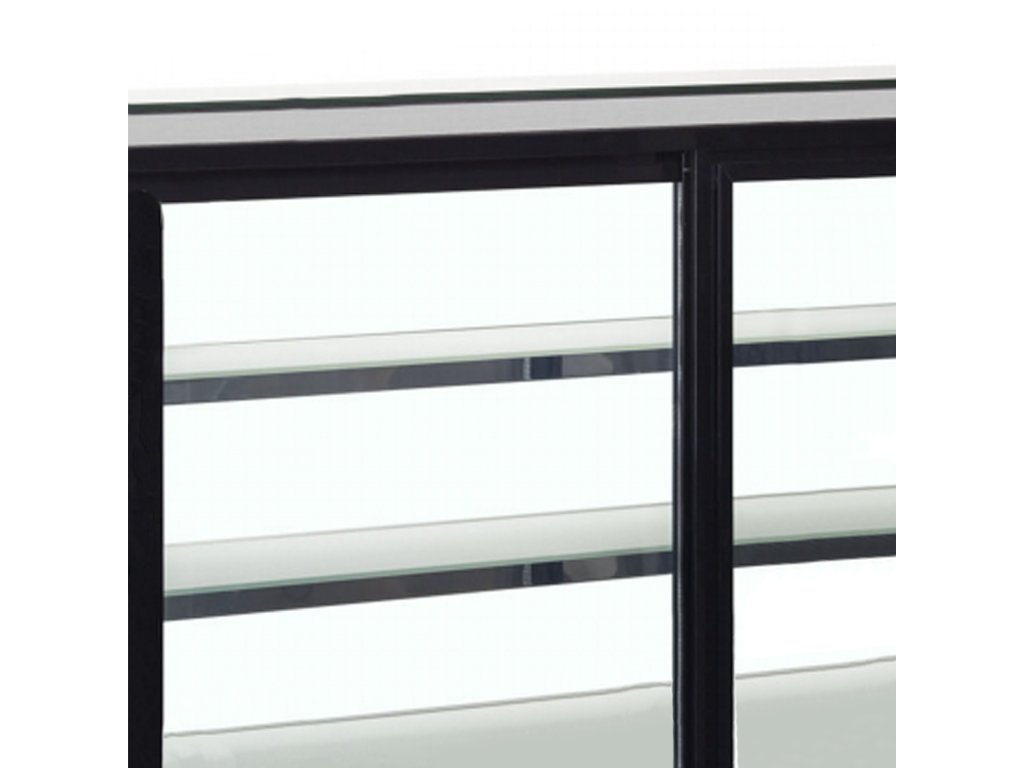 nehrdzavejúca oceľ a lesklý čierny sklenený rám|LED osvetlenie pod každou policou|nastaviteľné police (jedna úroveň)|zadné posuvné sklenené dvere|nastaviteľné nožičky a kolieska|rovné predné sklo|dvojité sklo|predné sklo, ktoré sa nezahmlieva