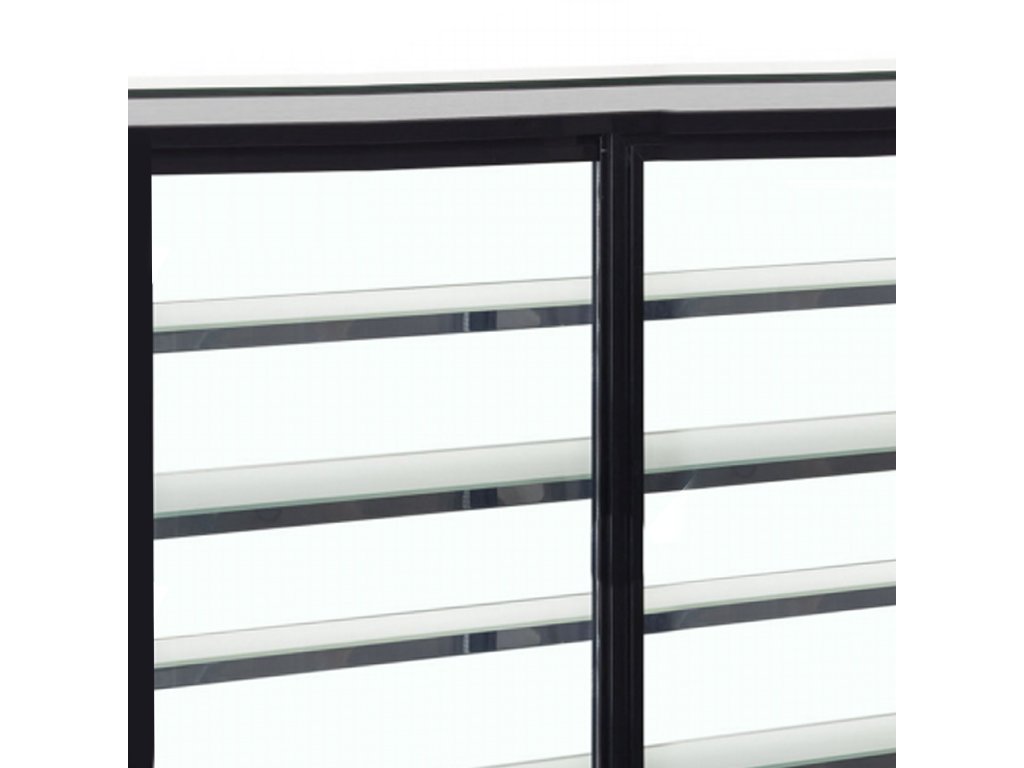 priestor na dodatočnú policu|nehrdzavejúca oceľ a lesklý čierny sklenený rám|dvojité sklo|predné sklo, ktoré sa nezahmlieva|LED osvetlenie pod každou policou|zadné posuvné sklenené dvere|ventilované chladenie|rovné predné sklo