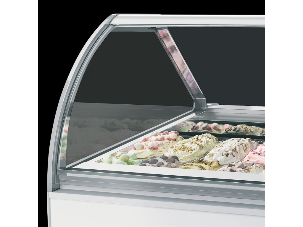 vynikajúca prezentácia výrobkov|vhodné pre 5l vaničky na zmrzlinu (nie sú súčasťou)|vyhrievané sklo zabraňujúce kondenzácii|dvojité izolačné sklo po stranách|vnútorné LED osvetlenie s vypínačom|digitálny termostat a zobrazenie teploty|zadné posuvné sklenené dvere
