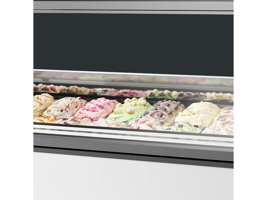 vynikajúca viditeľnosť výrobkov|rovné predné sklo|vhodné pre 5l vaničky na zmrzlinu (nie sú súčasťou)|vnútorné LED osvetlenie s vypínačom|digitálny termostat a zobrazenie teploty|predné presklené krídlové dvere (na vyžiadanie)|dvojité izolačné sklo po stranách|vyhrievané sklo zabraňujúce kondenzácii