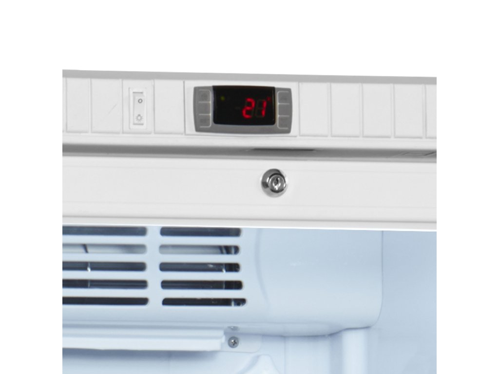 presklené krídlové dvere|elektronický termostat|akustický alarm|pripojenie externého alarmu|nastaviteľné police|automatické odmrazovanie|nastaviteľné nožičky|chladenie s pomocným ventilátorom|vnútorné LED osvetlenie