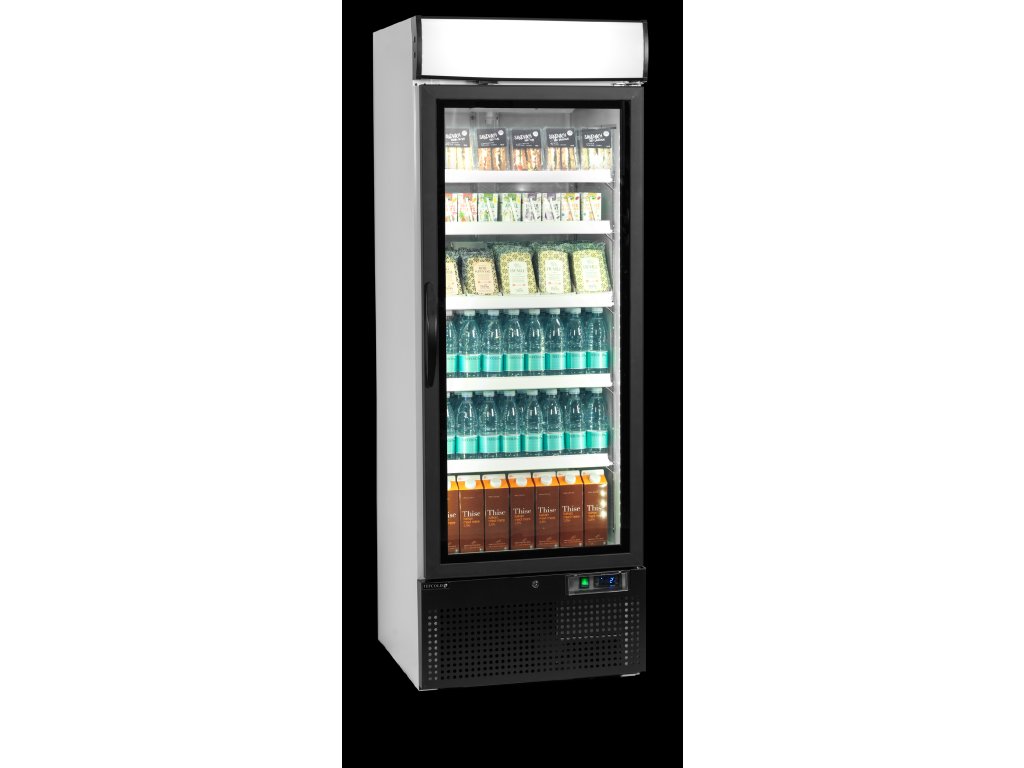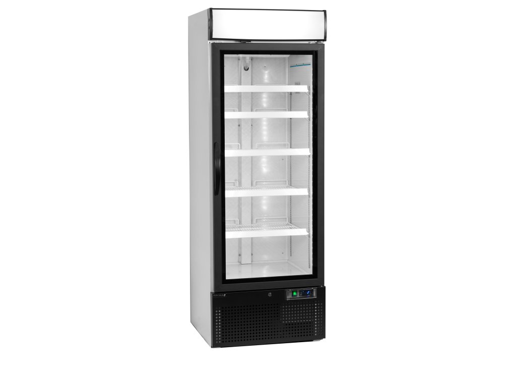 veľký úložný priestor|reklamný panel podsvietený LED|vnútorné vertikálne LED osvetlenie|samozatváracie presklené dvere|ventilované chladenie|nastaviteľné police|rovnaký ako mraziaci model