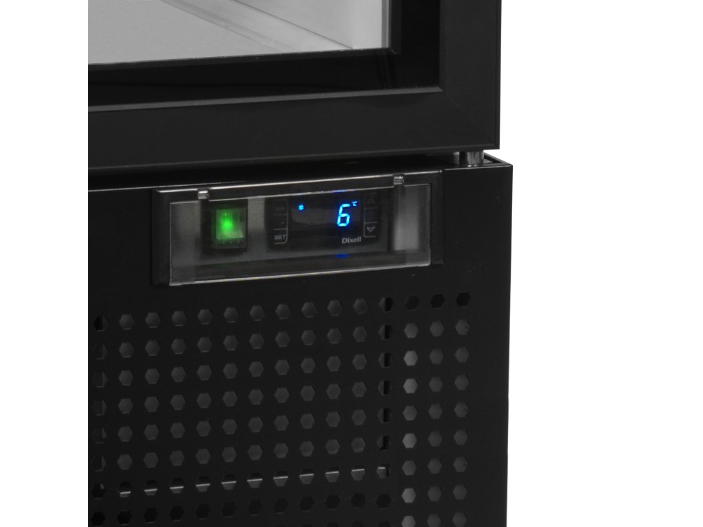 veľký úložný priestor|reklamný panel podsvietený LED|vnútorné vertikálne LED osvetlenie|samozatváracie presklené dvere|ventilované chladenie|nastaviteľné police|rovnaký ako mraziaci model