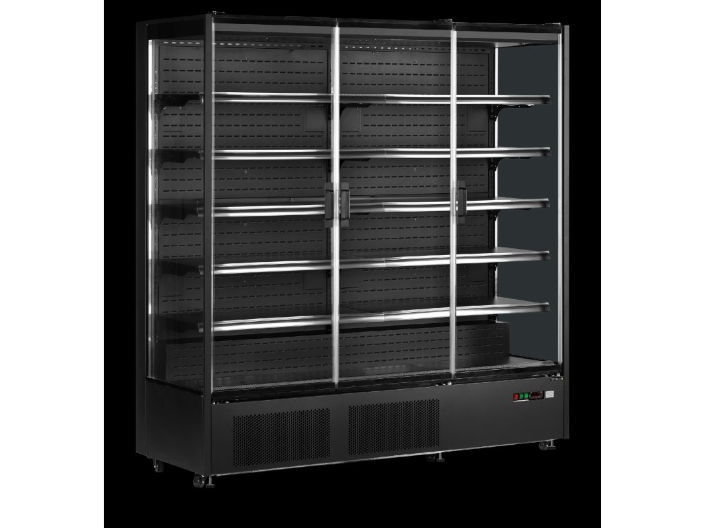 bezrámové presklenené dvere na skvelú viditeľnosť výrobkov|nízka spotreba energie|čierne vnútro a vonkajšok|nastaviteľné police s možnosťou náklonu|LED osvetlenie pod každou policou|ventilované chladenie pre rýchle a rovnomerné zníženie teploty|digitálny termostat a zobrazenie teploty|bočné steny štandardne presklené|transparentné cenovkové lišty o výške 33 mm|kolieska a nastaviteľné nožičky
