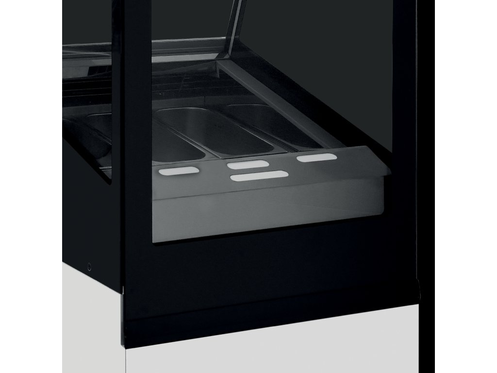 ventilované chladenie|vstavaný agregát|digitálny termostat|automatické odmrazovanie|automatické odparovanie kondenzátu|čelné sklo dvojité s čiernou sieťotlačou|čelné a bočné vyhrievané izolačné sklá|nerezová výstavná plocha|nerezová odkladacia doska|výklopné zadné plexi krytie|opláštenie MDF|LED osvetlenie - farba biela teplá|nastaviteľné nožičky|maximálna teplota okolia +30 °C a vlhkosť 55 %|GN nie sú súčasťou