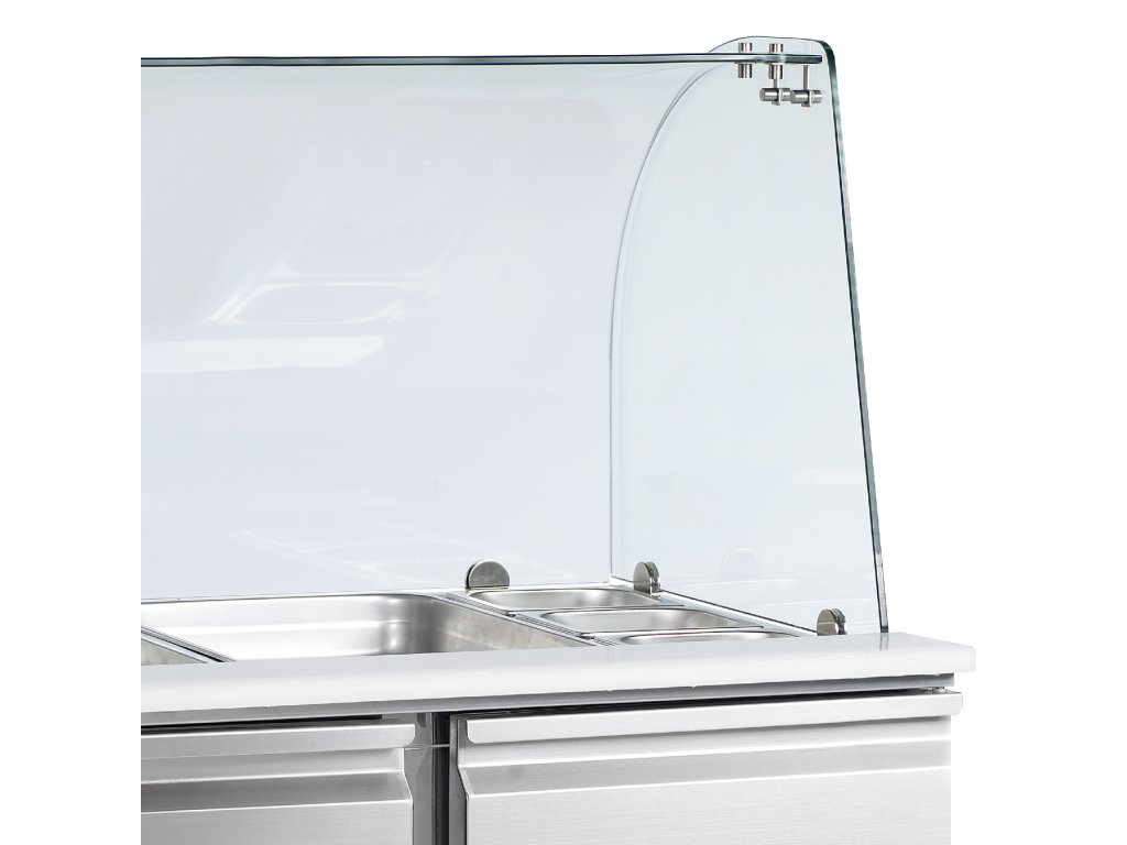 Rad SA chladiacich saladiet je vyrobený v celonerezovom prevedení SS304 s plnými dverami. Vrchný chladený priestor na ukladanie GN 1/1 je dodávaný s nerezovým zákrytom a plastovou pracovnou plochou. Vnútorný priestor obsahuje roštovú policu GN1/1 (1x vo dverách). Model je dodávaný bez GN. Saladety sú k dispozícii v rôznych veľkostiach. Modely s otvorenou hornou doskou pre nádoby GN sa dodávajú so sklenenou doskou, prípadne bez nej.