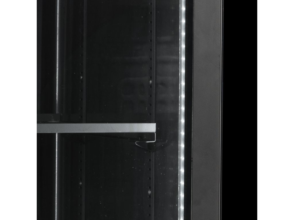 elegantný dizajn|vynikajúca prezentácia výrobkov|čierne vnútro a vonkajšok|mimoriadne vysoké presklené dvere|presklené krídlové dvere s hliníkovým rámom|vnútorné vertikálne a horizontálne LED osvetlenie|chladenie s pomocným ventilátorom
