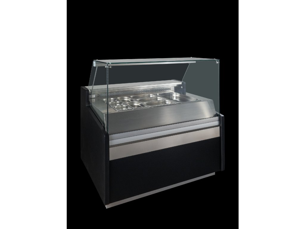 skvelá viditeľnosť produktov|presklené krytie na ochranu potravin|predné presklené krídlové dvere (na vyžiadanie)|možno vložiť GN1/1 (nie sú súčasťou)|ľahko prístupný úložný priestor|čierny vonkajšok|ventilované chladenie|automatické odmrazovanie|vnútorné LED osvetlenie
