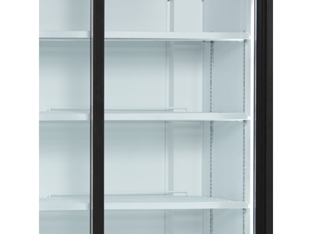samozatváracie posuvné presklené dvere, svetelný reklamný panel, vnútorné vertikálne osvetlenie, nastaviteľné police, nastaviteľné nožičky, ventilované chladenie