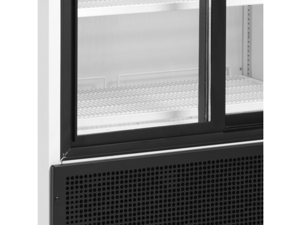 samozatváracie posuvné presklené dvere, svetelný reklamný panel, vnútorné vertikálne osvetlenie, ventilované chladenie, digitálny ukazovateľ teploty, nastaviteľné police, nastaviteľné nôžky s pojazdovými valčekmi vzadu
