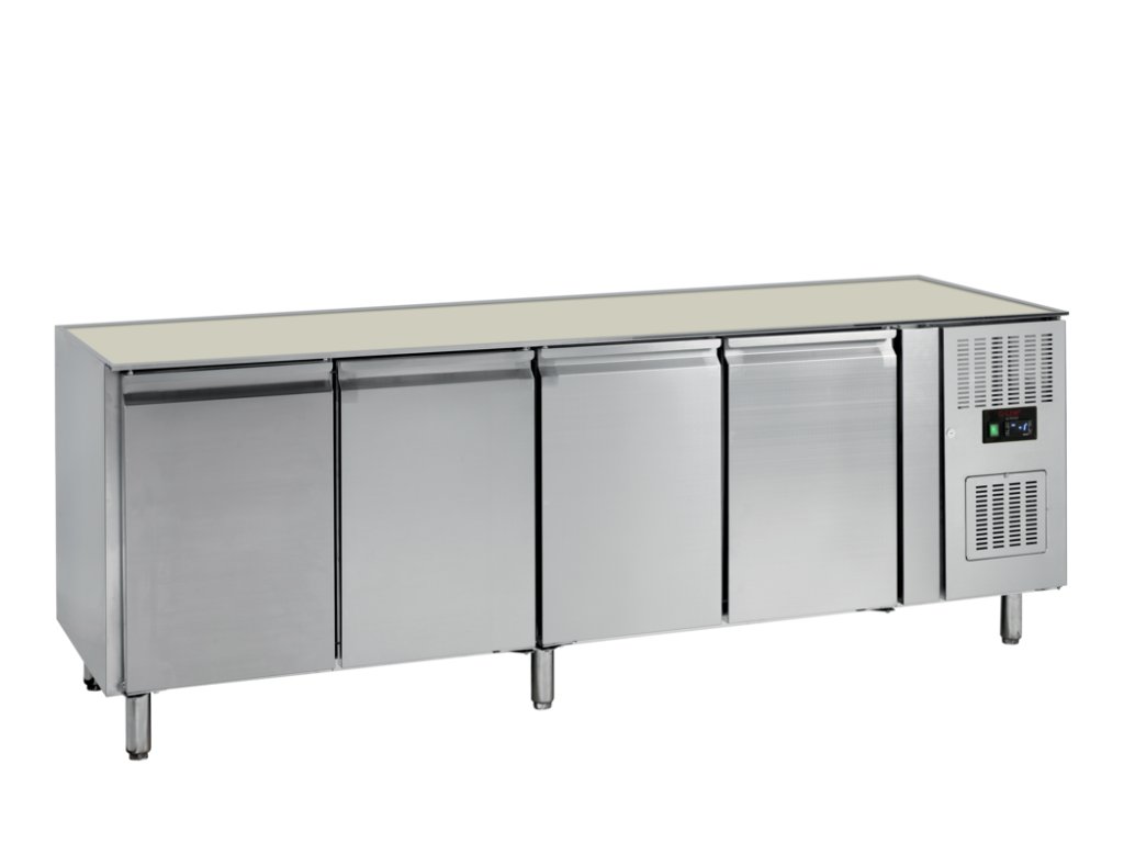 Tieto mraziace nerezové stoly sa dodávajú štandardne bez dosky, ktoré je možné dokúpiť na objednávku s lemom alebo bez lemu. Agregát je tiež možné zvoliť na pravej alebo ľavej strane. Stôl má samozatváracie dvere. Tieto stoly sú k dispozícii aj v chladiacej verzii.
