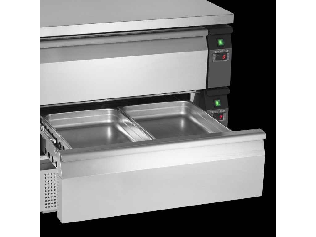 Rad kombinovaných chladiacich/mraziacich stolov UD ponúka flexibilné riešenie, pri ktorom môžete zásuvky jednotlivo prepínať z chladenia na mrazenie stlačením tlačidla. To je ideálne, keď je priestor obmedzený. Teplotný rozsah je možné nastaviť od -21 do -18 stupňov alebo od +1 do +4 stupňov. Je k dispozícii v dvoch rôznych šírkach, s 1 alebo 2 zásuvkami. Všetky sú dimenzované pre jedálne GN s hĺbkou do 150 mm. Horná doska je navrhnutá tak, aby odolala ťažkým spotrebičom, ako sú fritézy, rúry a podobne.