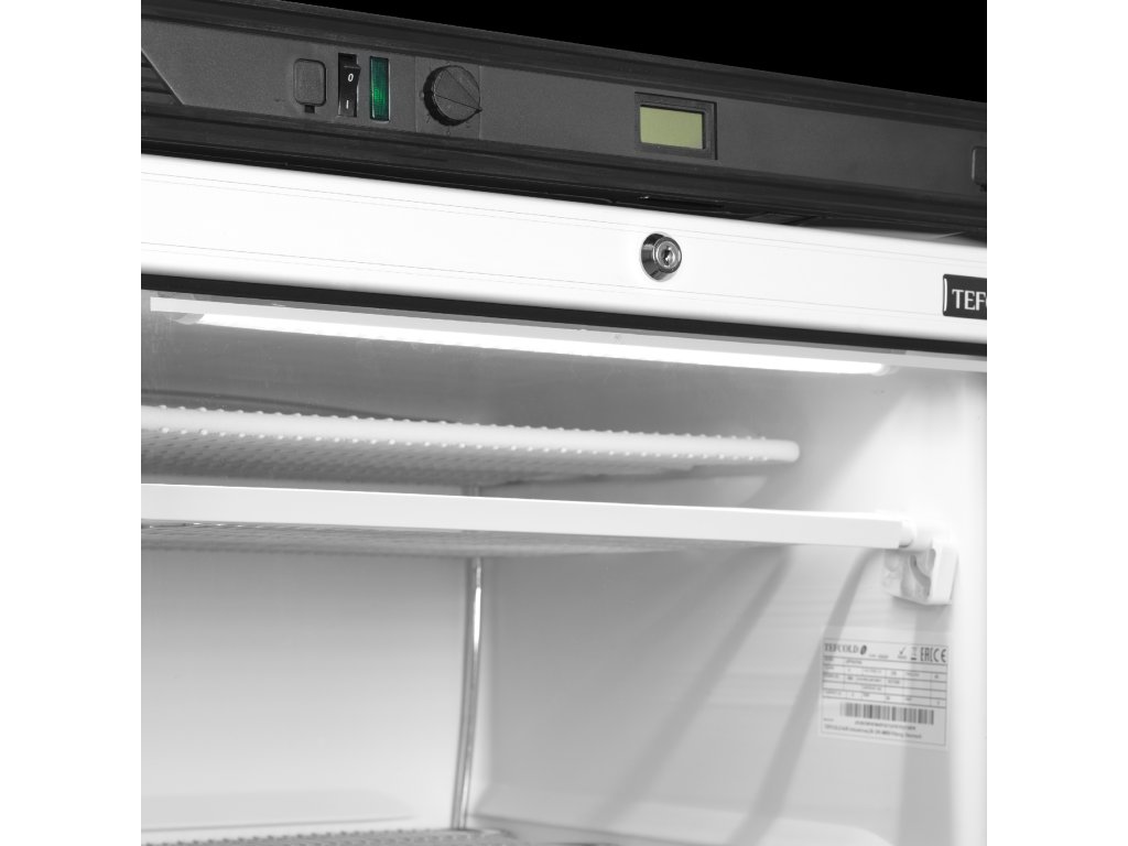 ľavé krídlové presklené dvere|vynikajúca prezentácia výrobkov|vyhrievané presklené dvere|pevné police na mrazenie|vnútorné LED osvetlenie|digitálny ukazovateľ teploty|odtok vody pri odmrazovaní|nastaviteľné nožičky
