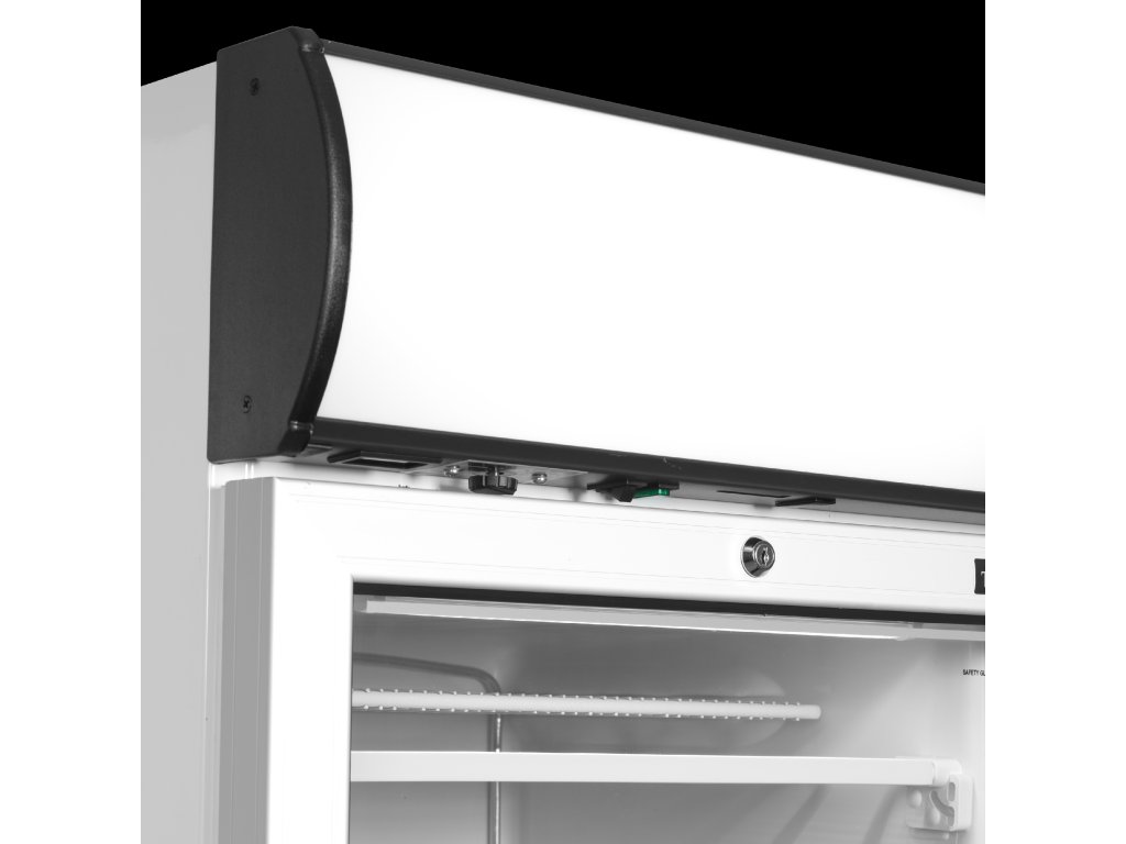 vynikajúca prezentácia výrobkov|svetelný reklamný panel|vyhrievané presklené dvere|pevné police na mrazenie|vnútorné LED osvetlenie|digitálny teplomer|odtok vody pri odmrazovaní|nastaviteľné nožičky