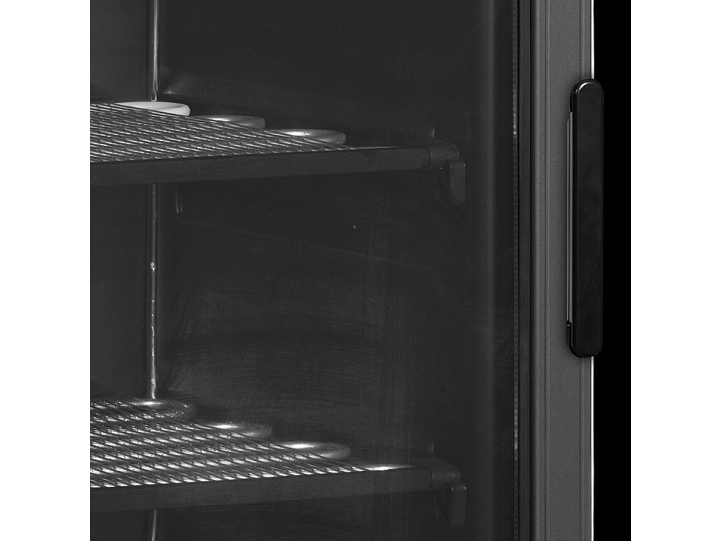 vynikajúca prezentácia výrobkov|ľavé krídlové presklené dvere|vyhrievané presklené dvere|čierne vnútro a vonkajšok|digitálny teplomer|vnútorné osvetlenie|pevné police|odtok vody pri odmrazovaní|nastaviteľné nožičky
