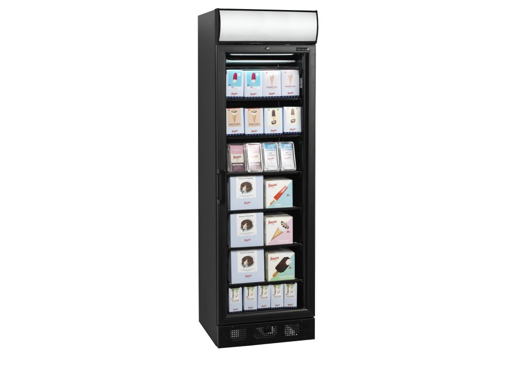Rad mraziacich skríň s presklenými dverami UFSC ponúka skvelú prezentáciu výrobkov a konkurencieschopnú cenu. Má vyhrievané presklené dvere, statické chladenie a pevné mraziace police so zabudovanými výparníkovými cievkami, ktoré zabezpečujú rovnomernú teplotu v celej skrini. Mraziaca skriňa s presklenými dverami sa dodáva v čiernej a bielej farbe, so svetelným panelom alebo bez. "LH" označuje ľavé otváranie dverí.