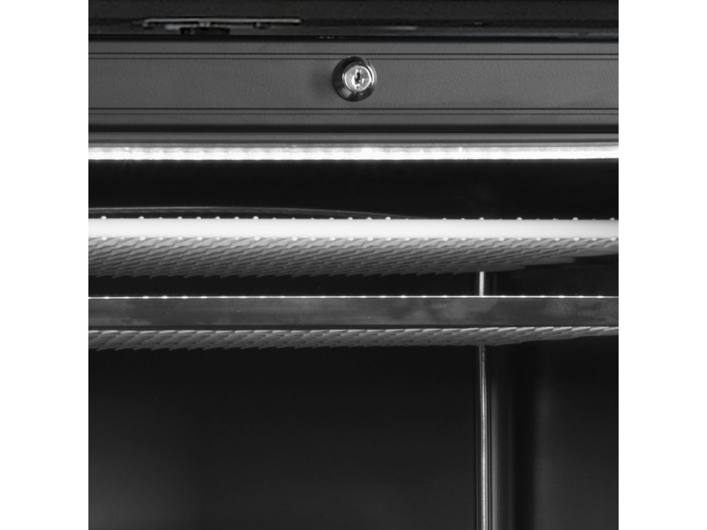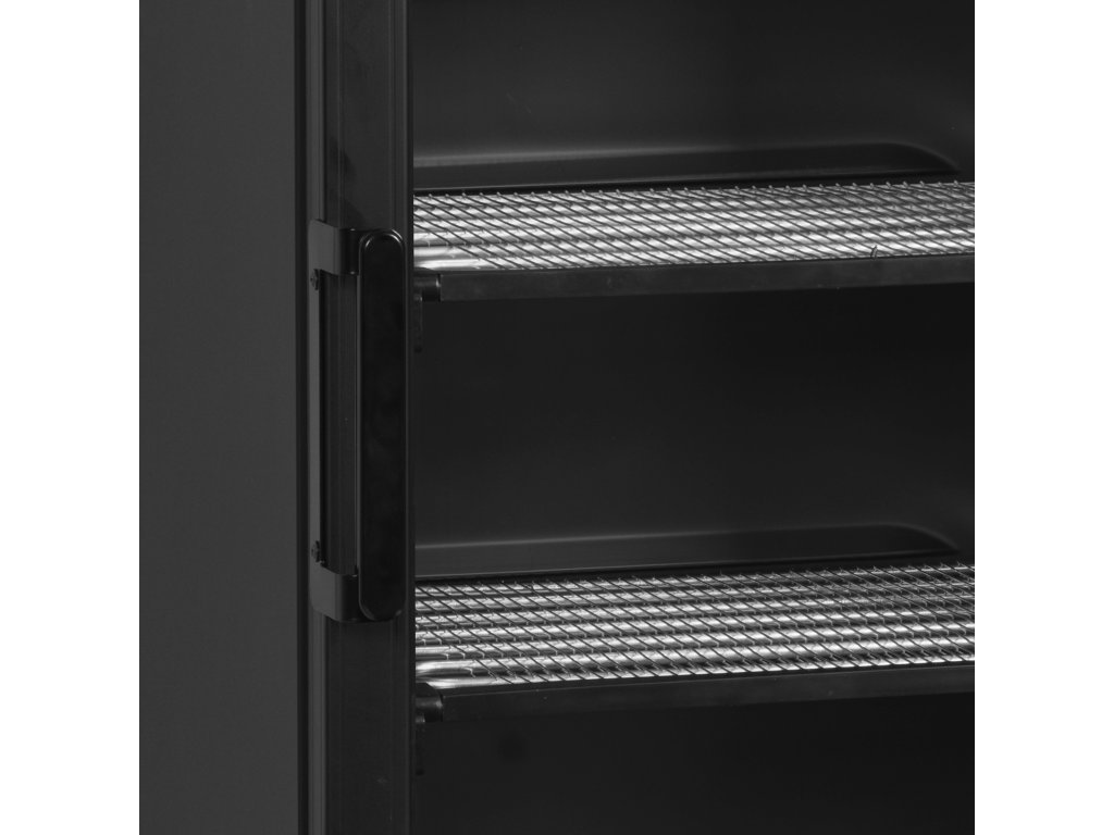 vynikajúca prezentácia výrobkov|čierne vnútro a vonkajšok|vyhrievané presklené dvere|svetelný reklamný panel|digitálny teplomer|vnútorné osvetlenie|pevné police|odtok vody pri odmrazovaní
