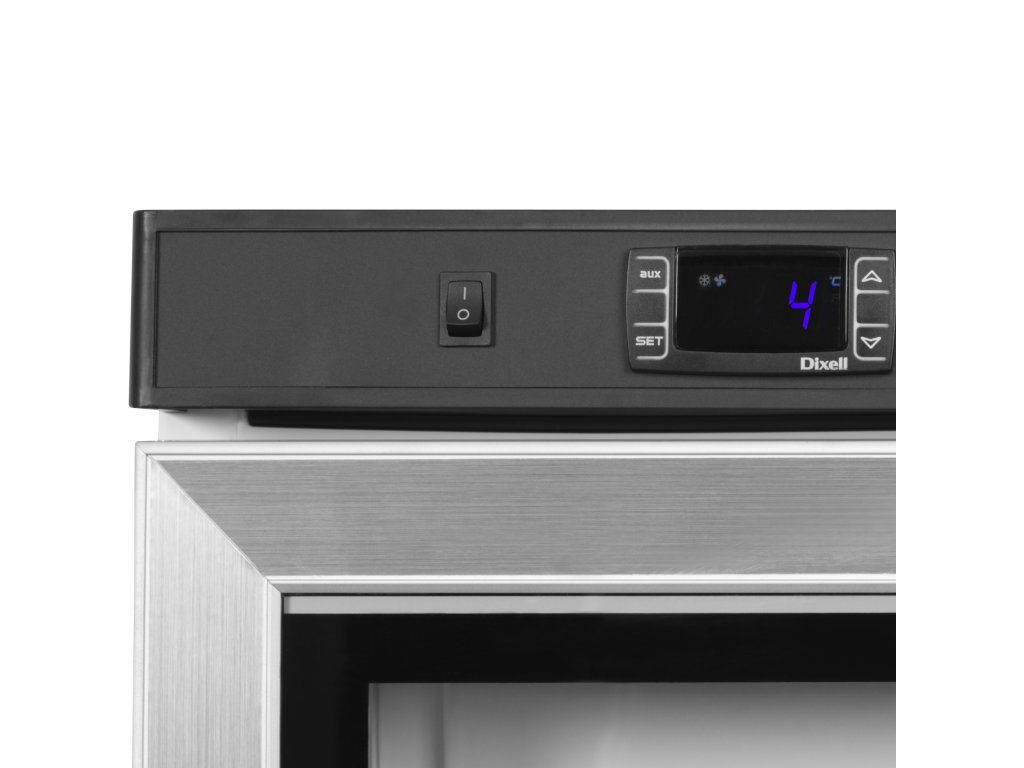 presklené krídlové dvere|elektronický termostat|nastaviteľné police|chladenie s pomocným ventilátorom|nerezové prevedenie|plne automatická prevádzka|nastaviteľné nôžky s pojazdovými valčekmi vzadu|vnútorné LED osvetlenie s vypínačom