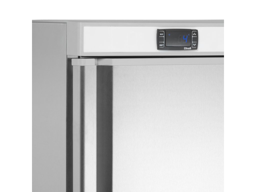 nerezové prevedenie|integrované madlo|plné dvere, možno zmeniť otváranie|elektronický termostat|chladenie s pomocným ventilátorom|nastaviteľné police|zámok|nastaviteľné nôžky s pojazdovými valčekmi vzadu|digitálny termostat a zobrazenie teploty