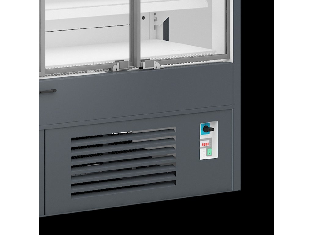 ventilované chladenie|posuvné presklené dvere s šedým rámom|vstavaný agregát|digitálny termostat|automatické odmrazovanie|automatické odparovanie kondenzátu|5 chladených nastaviteľných políc|plexi zábrana police - 2 horné rady|cenovkové lišty|chladená výstavná plocha|LED osvetlenie vitríny horné a bočné - farba biela studená|presklené izolačné alebo plné bočnice