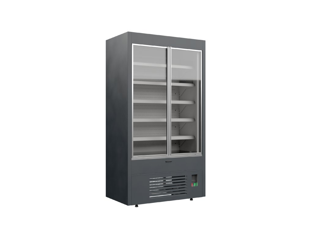 ventilované chladenie|krídlové dvere|dvojité sklo|vstavaný agregát|digitálny termostat|automatické odmrazovanie|automatické odparovanie kondenzátu|5 chladených nastaviteľných políc|plexi zábrana police - 2 horné rady|cenovkové lišty|chladená výstavná plocha|LED osvetlenie vitríny horné a bočné - farba biela studená|presklené izolačné alebo plné bočnice