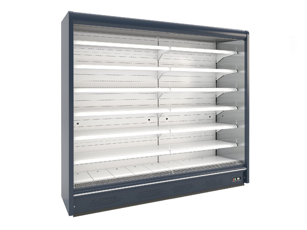 ventilované chladenie|otvorená s nočnou roletou|nástrekový ventil - možnosť chladiv R452A, R448A, R449A|bez zabudovaného agregátu (chladiaci výkon 1350 W / 1 bm pri odparovacej teplote -10 °C)|digitálny termostat|automatické odmrazovanie|chladená výstavná plocha|chladené nastaviteľné police - nosnosť 150 kg / m2|plexi zábrana police - 2 horné rady|LED osvetlenie vitríny horné a bočné - farba biela studená|plné alebo presklené bočnice|cenovkové lišty