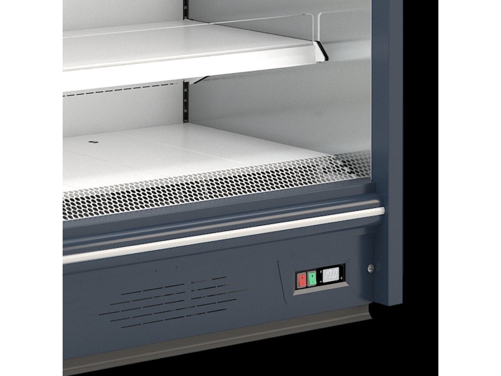 ventilované chladenie|otvorená s nočnou roletou|nástrekový ventil - možnosť chladiv R452A, R448A, R449A|bez zabudovaného agregátu (chladiaci výkon 1350 W / 1 bm pri odparovacej teplote -10 °C)|digitálny termostat|automatické odmrazovanie|chladená výstavná plocha|chladené nastaviteľné police - nosnosť 150 kg / m2|plexi zábrana police - 2 horné rady|LED osvetlenie vitríny horné a bočné - farba biela studená|plné alebo presklené bočnice|cenovkové lišty