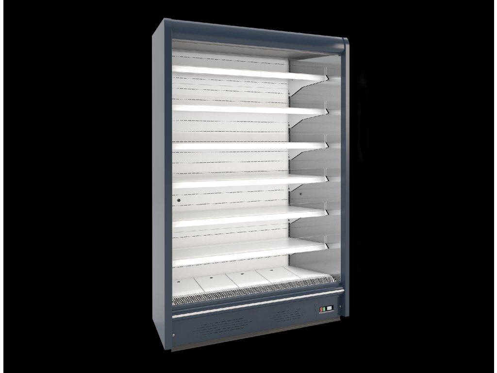 ventilované chladenie|otvorená s nočnou roletou|bez zabudovaného agregátu (chladiaci výkon 1350 W / 1 bm pri odparovacej teplote -10 °C)|nástrekový ventil - možnosť chladiv R452A, R448A, R449A|digitálny termostat|automatické odmrazovanie|chladená výstavná plocha|chladené nastaviteľné police - nosnosť 150 kg / m2|plexi zábrana police - 2 horné rady|LED osvetlenie vitríny horné a bočné - farba biela studená|plné alebo presklené bočnice|cenovkové lišty