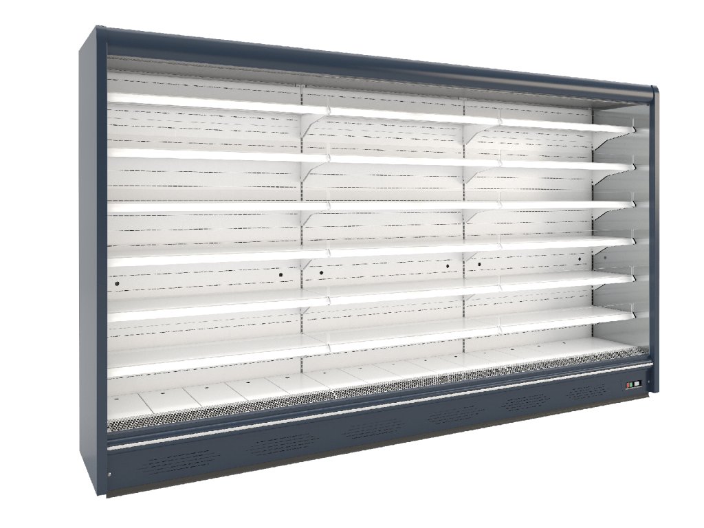ventilované chladenie|otvorená s nočnou roletou|bez zabudovaného agregátu (chladiaci výkon 1350 W / 1 bm pri odparovacej teplote -10 °C)|nástrekový ventil - možnosť chladiv R452A, R448A, R449A|digitálny termostat|automatické odmrazovanie|chladená výstavná plocha|chladené nastaviteľné police - nosnosť 150 kg / m2|plexi zábrana police - 2 horné rady|LED osvetlenie vitríny horné a bočné - farba biela studená|plné alebo presklené bočnice|cenovkové lišty