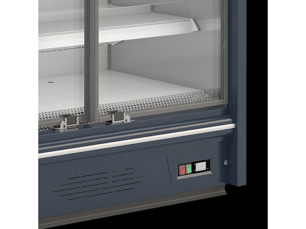 ventilované chladenie|posuvné dvere so šedým rámom|dvojité izolačné sklá|nástrekový ventil - možnosť chladiv R452A, R448A, R449A|bez zabudovaného agregátu (chladiaci výkon 900 W / 1 bm pri odparovacej teplote -10 °C)|digitálny termostat|automatické odmrazovanie|chladená výstavná plocha|chladené nastaviteľné police - nosnosť 150 kg / m2|plexi zábrana police - 2 horné rady|LED osvetlenie vitríny horné a bočné - farba biela studená|plné alebo presklené bočnice|cenovkové lišty